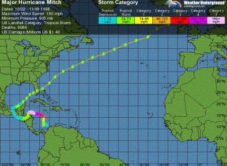 Hurricane Mitch was one of the most powerful tropical storms ever recorded. The almost three week storm began near Africa on October 22, 1998 and finally dissolved on November 9th near Great Britain. The storm devastated many villages and towns of Honduras, Nicaragua, Latin and Central America and even caused damage in Florida. Of the countries involved, Honduras lost the most lives to this terrible storm – about 7,000. Thousands of homes were also taken.
